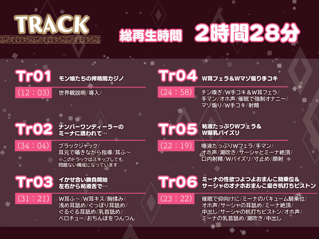 今すぐ読む!完全版を読む!【W舌技×Wオホ】モン娘闇カジノ〜いじわる兎娘とダウナー系ゴーレム娘の搾精種馬計画♪〜発売日: 2025年8月31日ボリューム: 6本 (約148分)+αジャンル: 男性向け、成人向け、音声付き、巨乳、中出し、フェラ、パイズリ、ハーレム... -