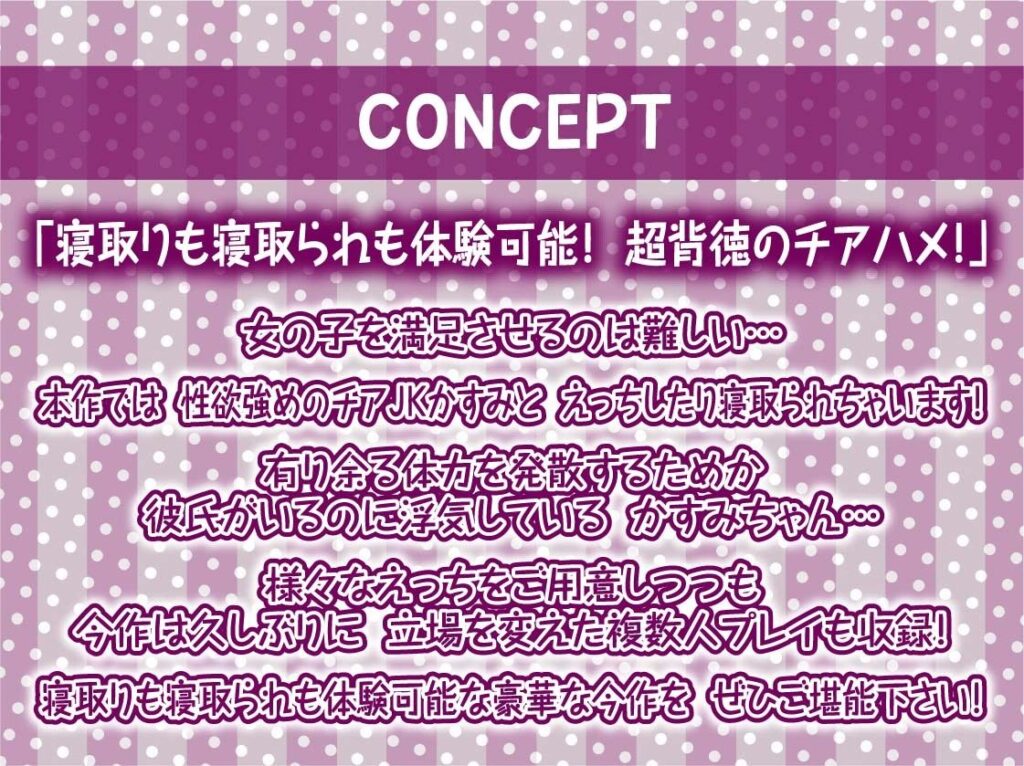 今すぐ読む!完全版を読む!【オホ声応援えっち】チアハメ。〜彼氏持ちチアJKのドスケベ応援喘ぎオホ声〜発売日: 2025年12月2日ボリューム: 10本 (約160分)+αジャンル: 寝取り・寝取られ・NTR、中出し、フェラ、3P・4P、癒し、男性向け、成人向け、学生【F...