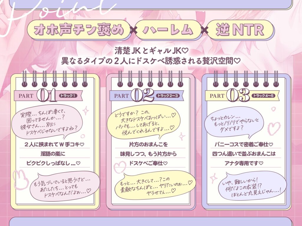 【W密着囁き】オホ声チン褒めハーレム〜ギャル&清楚JKに巨根バレ⇒爆乳Wビッチから求められまくるおまんこ食べ比べ逆NTR性活♪